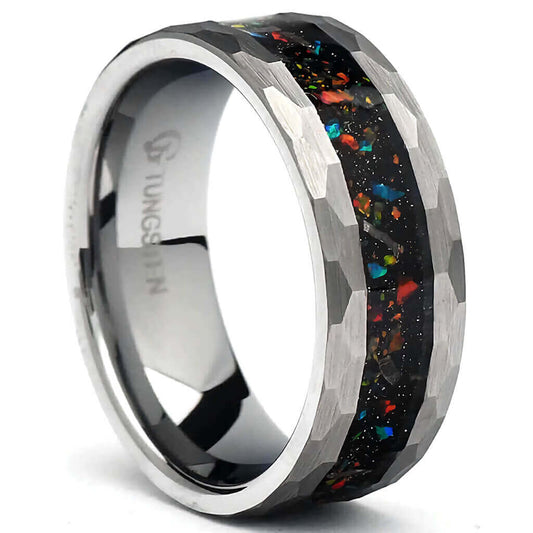 GOLEN Tungsten Galaxy Opal Wedding Band - Hammered