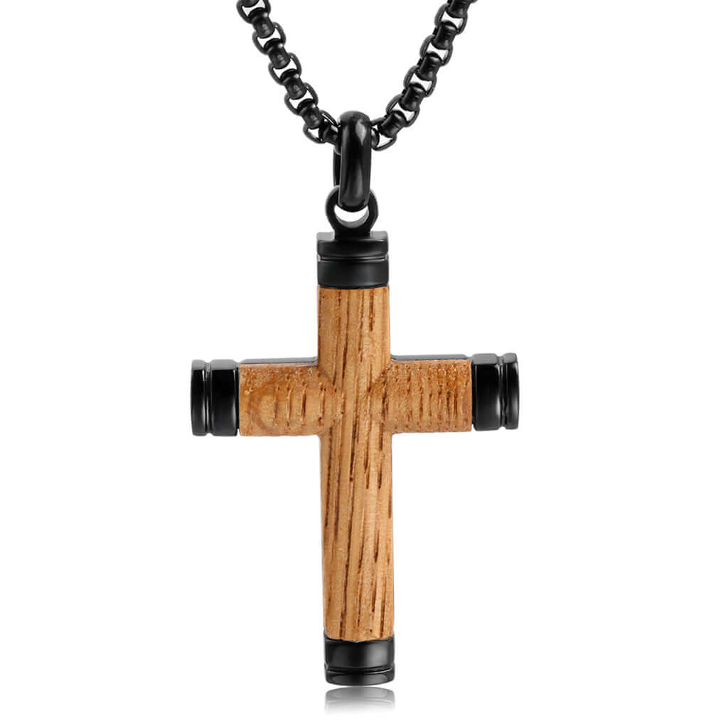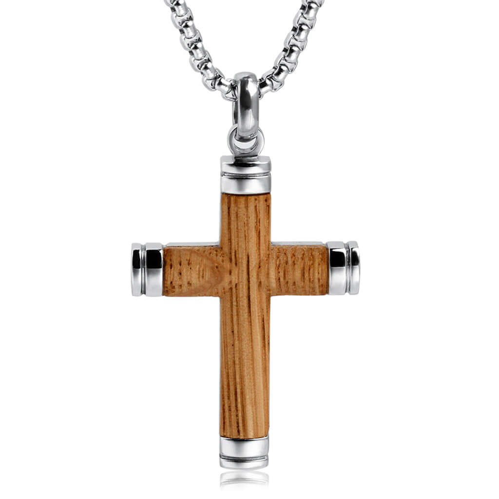 This men's cross necklace pendant is made of stainless steel and features a genuine whiskey barrel wood inlay. The stainless steel is polished to a high shine, while the wood inlay adds a unique and rustic touch. The cross pendant hangs from a sturdy stainless steel rope chain, making it a stylish and meaningful accessory. The perfect gift for any man, this cross necklace will be treasured for years to come.