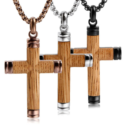 Wood Men's Cross Necklace Pendant Stainless Steel 24" Chain