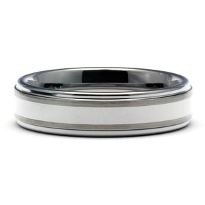 This silver finish 6mm wide Tungsten wedding band is crafted with immense thought and precision. The flat top is blended with brushed tone stripes to add an element of novelty and spark to the design. The ring's interior is very well polished to offer you a comfortable fit and to ensure that your finger doesn't change its color if the ring is worn for a long duration.